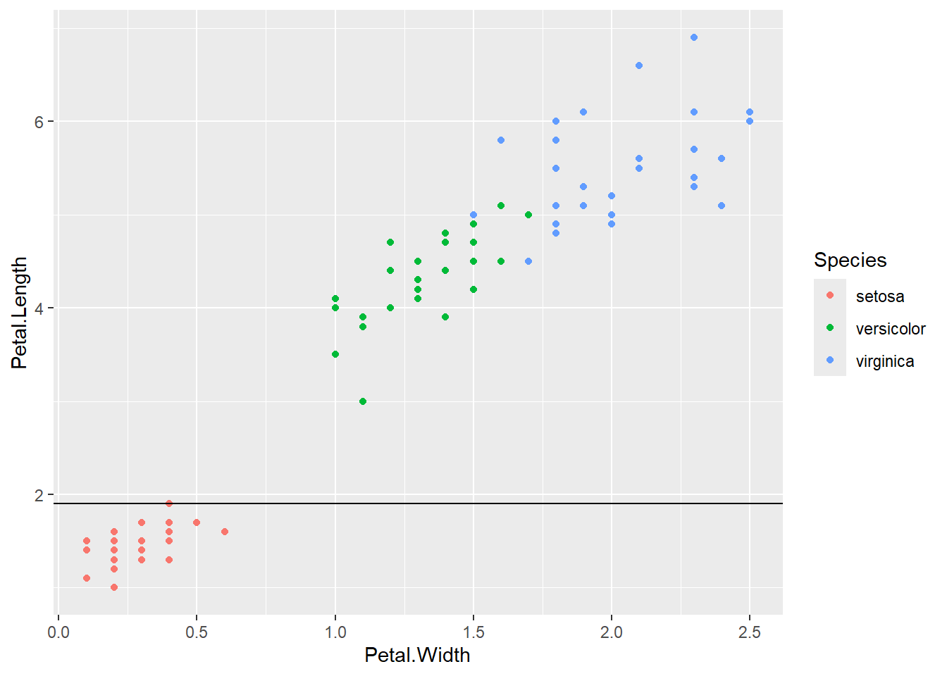 From the above plot, we see that we can easily classify the flowers with high accuracy using these two features. For example, if we draw the horizontal line \(y = 1.9\), we could classify any iris lying on or below this line as setosa with \(100\%\) accuracy.