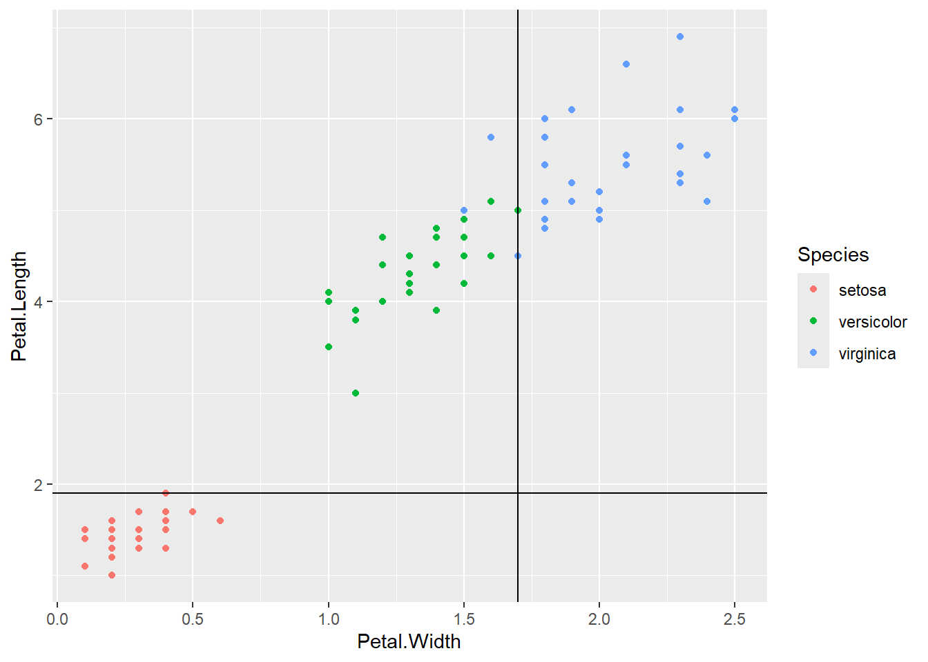 Next, we draw the vertical line \(x = 1.7\). We could classify any iris lying on or to the left of this line as versicolor.