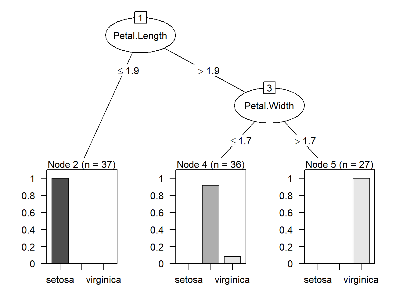 ## 7) Petal.Width > 1.75 37 0.00 virginica ( 0.00000 0.00000 1.00000 ) *The summary() function lsts the variables that are used as internal nodes in the tree, the number of terminal nodes, and the (training) error rate.