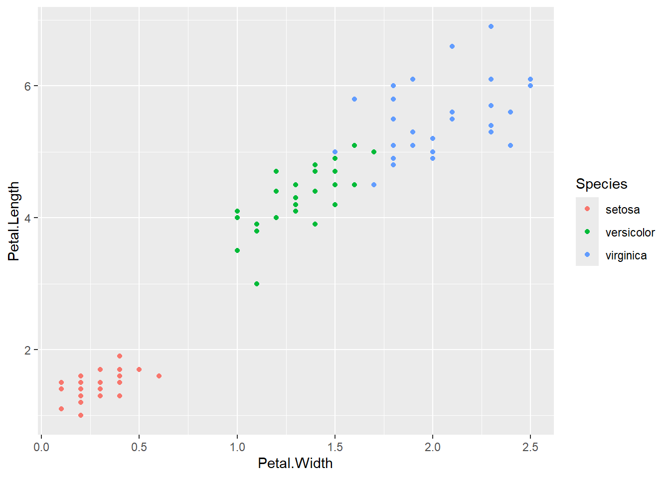 From the plots, it seems that the variable Petal.Width and Petal.Length will be useful in classifying the flowers. Let’s focus on the scatterplot of these two variables.