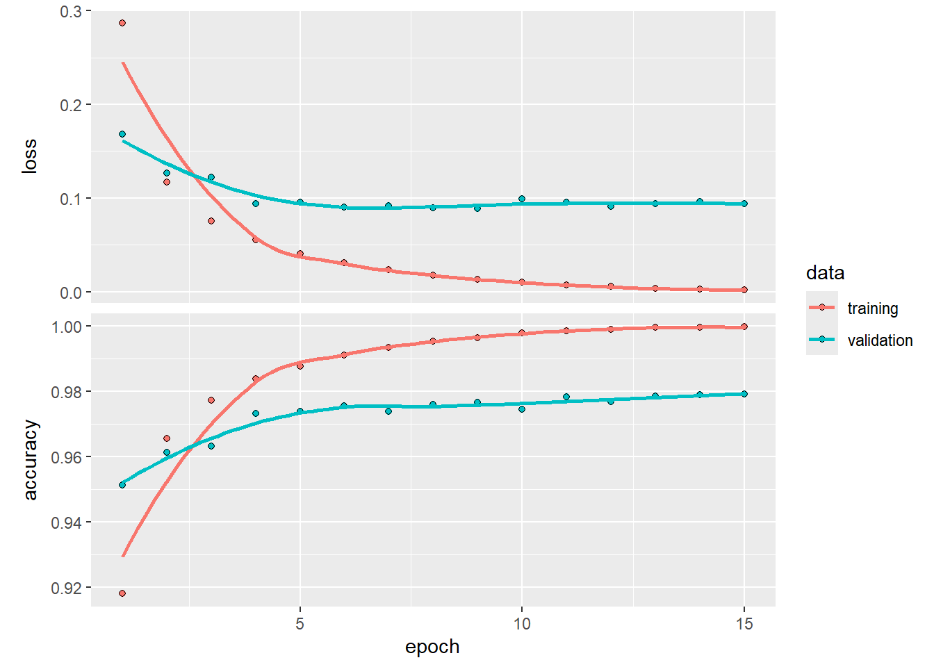 validation_labels <- train_labels[index, ]Train the model with \(15\) epochs and evaluate the loss using the validation data: