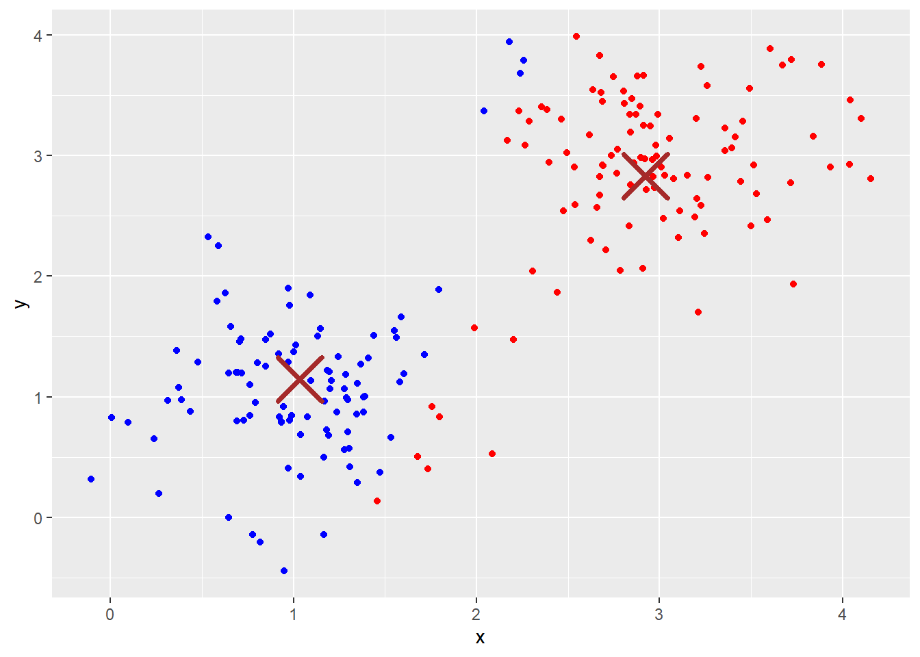 For each \(j=1,\ldots,k\), \(l=1,\ldots,p\), set \[ \mu_{jl} = \frac{\sum^n_{i=1}I(C_i =j) x_{il}}{\sum^n_{i=1}I(C_i =j)}. \] In words, \(\mu_j\) is simply the mean of all the points assigned to \(j\)th cluster. Note that \(\mu_j = (\mu_{j1},\ldots,\mu_{jp})\).