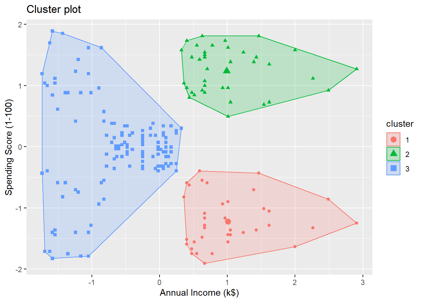 Let’s perform a \(k\)-means clustering on the customers using Annual Income (k$) and Spending Score (1-100) with \(k=3\).