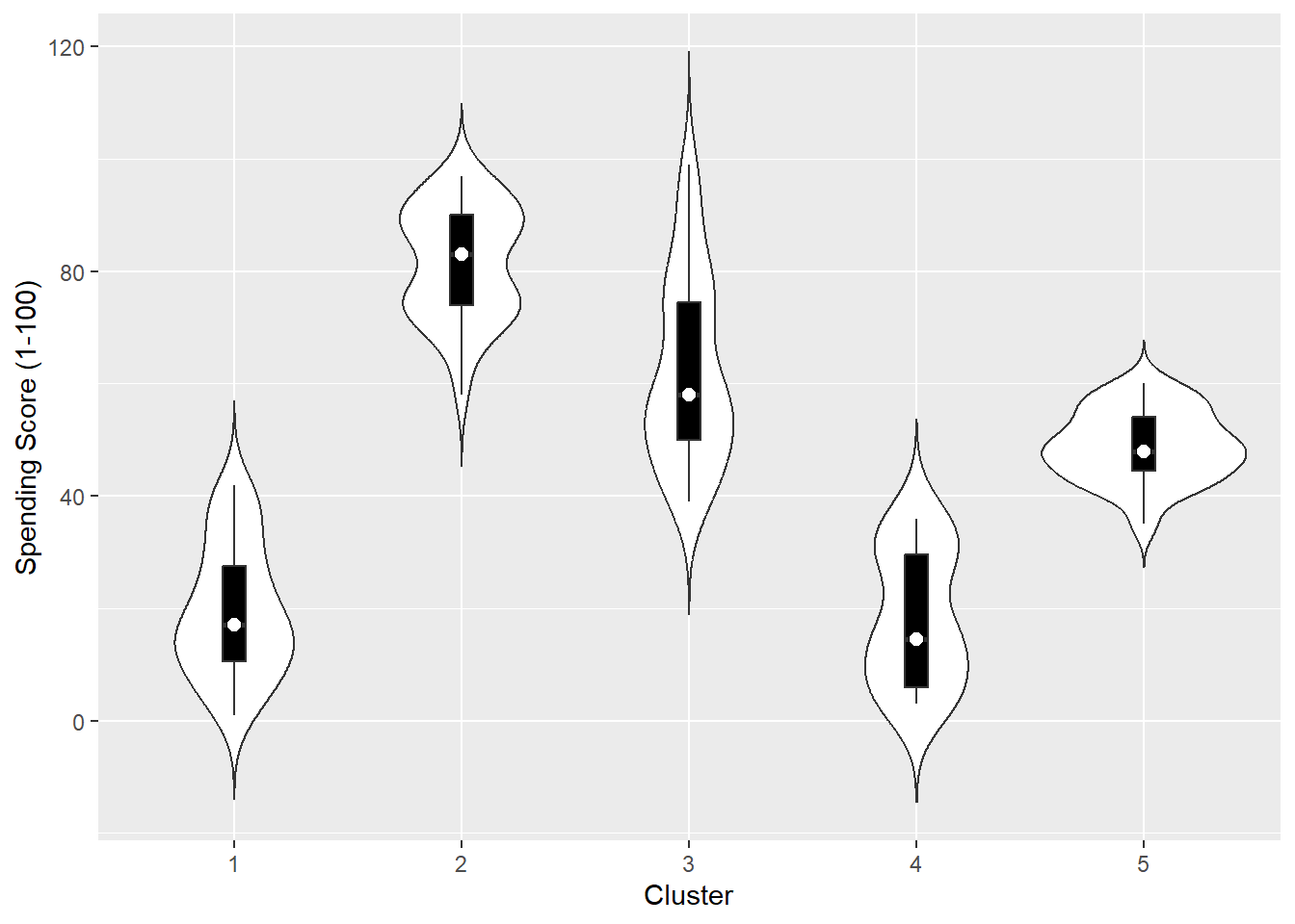 To understand more about the clusters, we should take a look at some plots and some summary statistics. An example is to use violin plots.