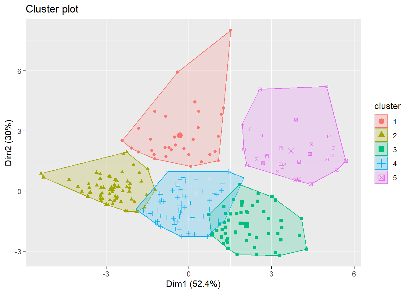 To visualize more than 2 variables, we can use a dimension reduction technique called principal component analysis. The function fviz_cluster will automatically perform that and give you a \(2D\)-plot using the first two principal comonents.