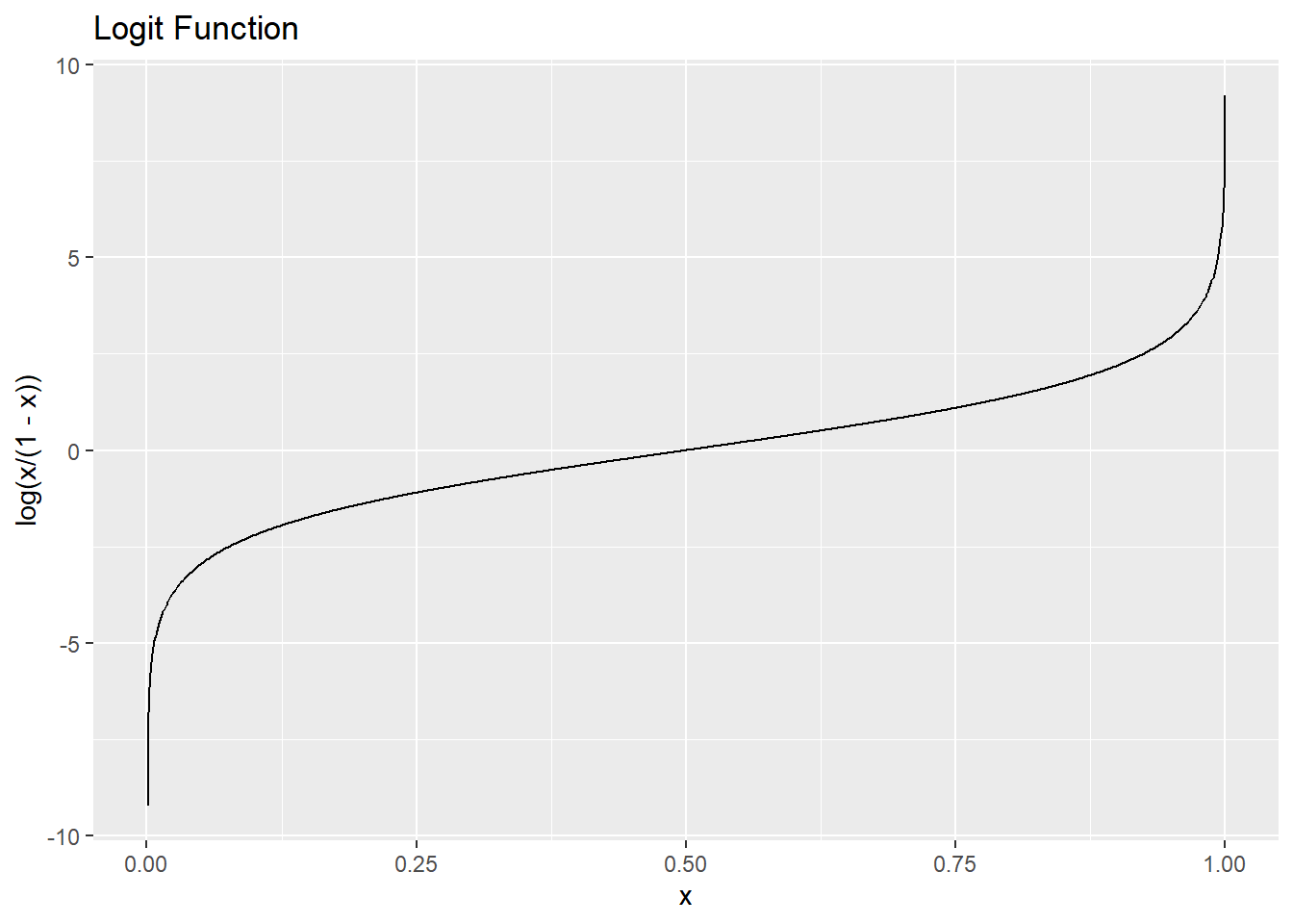The logit function, \(\text{logit}:(0, 1) \rightarrow \mathbb{R}\), is defined as \[\begin{equation*} \text{logit}(p) = \log \frac{p}{1-p}. \end{equation*}\]