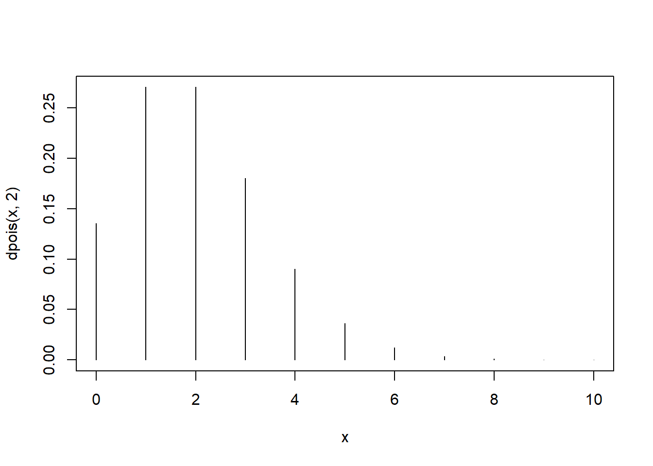 - Plot the Poisson pmf with parameter \(2\) from \(x = 0\) to \(x = 10\).