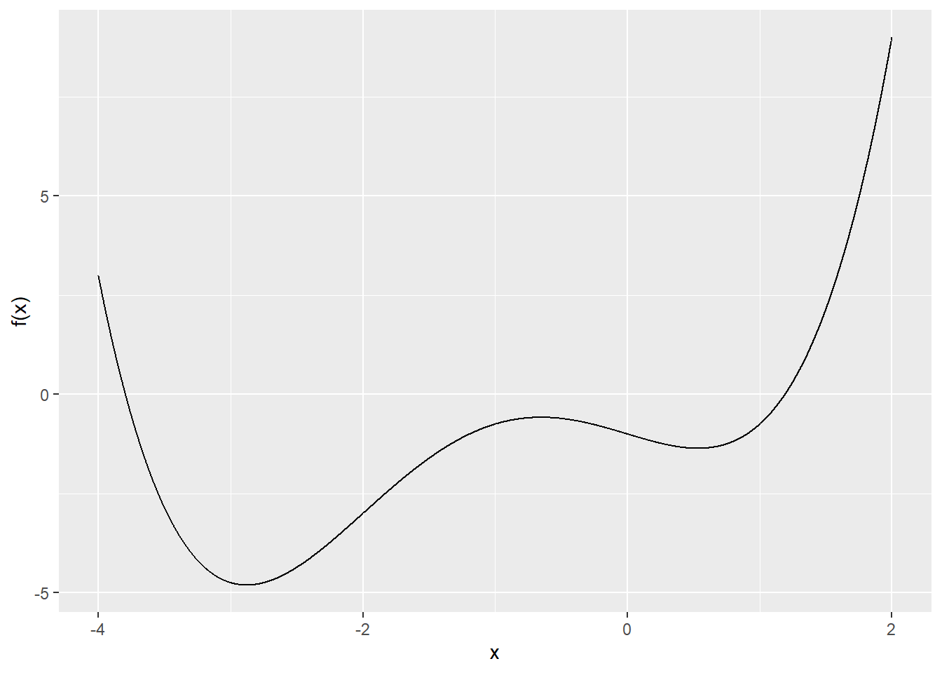 ## Error in grad_des(fp, x0 = -2, h = 0.01, max_iter = 2): Maximum number of iterations reachedRemark: to find a local maximum, use gradient ascent.
