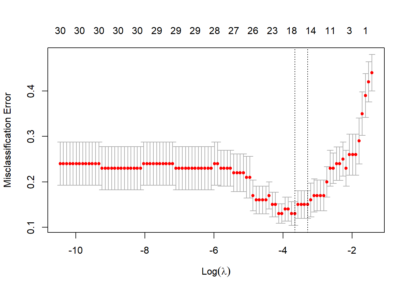 The objective function for penalized logistic regression is: \[\begin{equation*} \min_{(\beta_0, \beta)\in\mathbb{R}^p } \left\{ -\left[ \frac{1}{n}\sum^n_{i=1} \left( y_i (\beta_0 + \beta^\top x_i) - \log (1+e^{\beta_0 + \beta^\top x_i })\right) \right] + \lambda \left[\frac{1-\alpha}{2} \|\beta\|^2_2 + \alpha\|\beta\|_1 \right] \right\}. \end{equation*}\]
