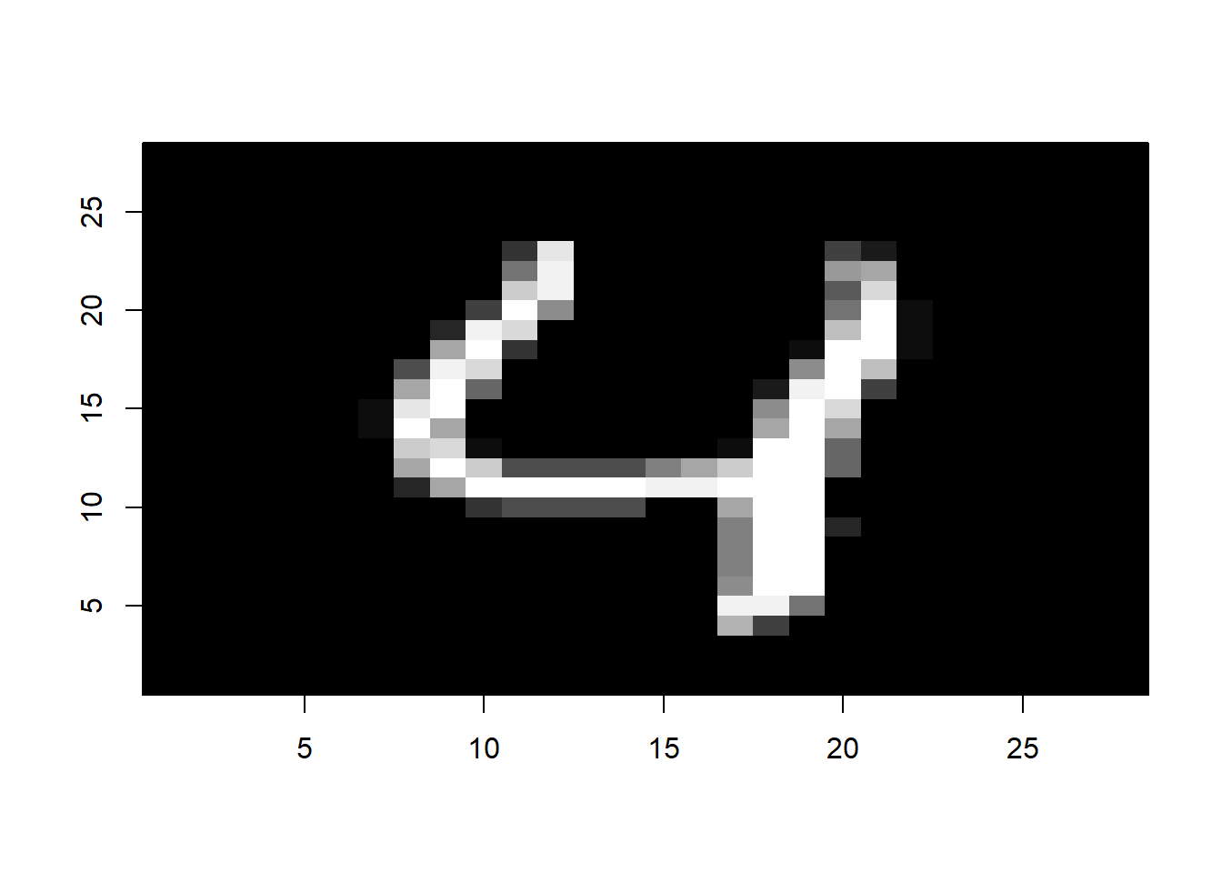image(1:28, 1:28, matrix(mnist$test$images[i,], nrow = 28)[ , 28:1],